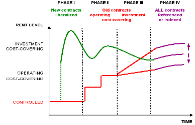 Second, the agreement of tenants to a decontrol process cannot be obtained without a proportional service being provided by the landlord. This is clear in the case of rents that are not sufficient to cover current operating costs (Phase II in figure 1). However, beyond that level rent adjustments should be permitted in exchange for capital repairs and modernizations (Phase III in figure 1).