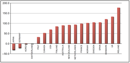 The McKinsey Global Institute’s 2009 study of the global financial system also provides estimates of losses by major countries (Figure 5). The U.S. experienced the largest wealth losses because it is the largest financial system and also the epicenter of the crisis. The U.S. losses were USD5.5 trillion for an estimated wealth loss of 38.6 percent of GDP. The magnitude of this loss ratio is very high, but there are other ways of measuring the scale of a financial crisis beyond measuring the fall in the value of financial and real estate assets.